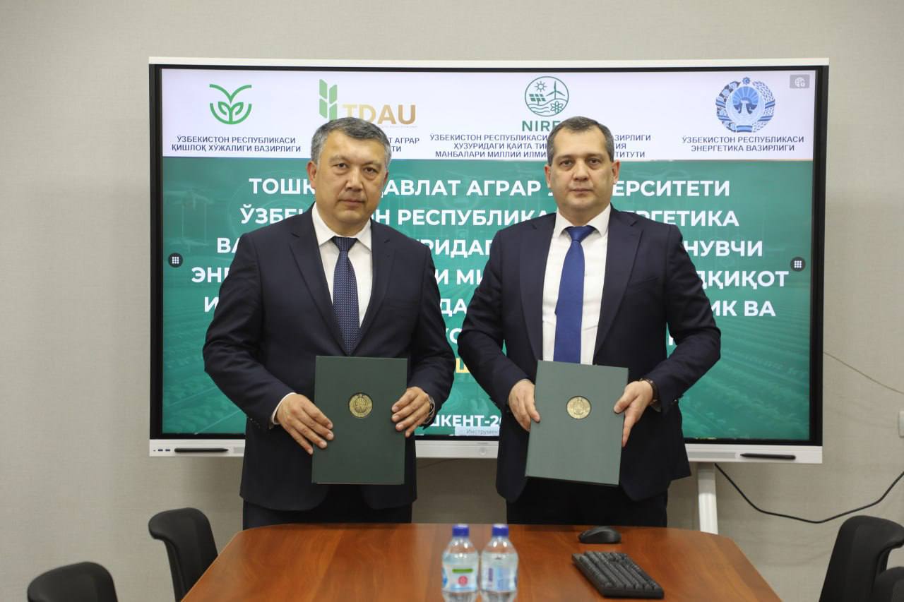 A significant agreement on scientific, educational, technical, and practical cooperation has been signed between the Tashkent State Agrarian University and the National Research Institute of Renewable Energy Sources under the Ministry of Energy. Within the framework of this partnership, faculty members, doctoral students, and master's students of the Faculty of Agroengineering and Technologies will have the opportunity to conduct their scientific research in close connection with direct production. Additionally, effective and systematic internship programs will be established for students within an environment of the most modern industry technologies.