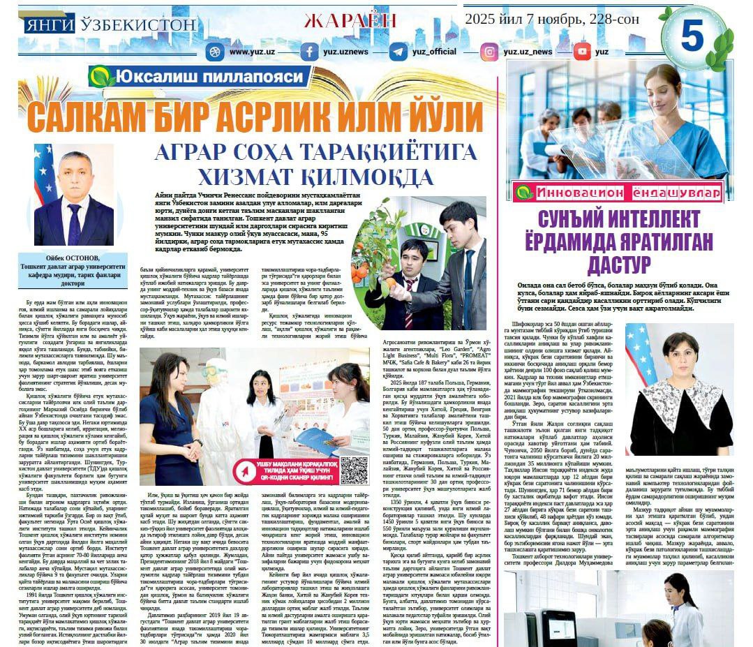 In the November 7, 2025 issue No. 228 of the newspaper “Yangi Uzbekistan”, an article by Doctor of Historical Sciences O. Ostonov, Head of the Department of Social and Humanitarian Sciences of Tashkent State Agrarian University, entitled “An Almost Century-Long Path of Science Serves the Development of the Agrarian Sector”, was published in honor of the university’s 95th anniversary.