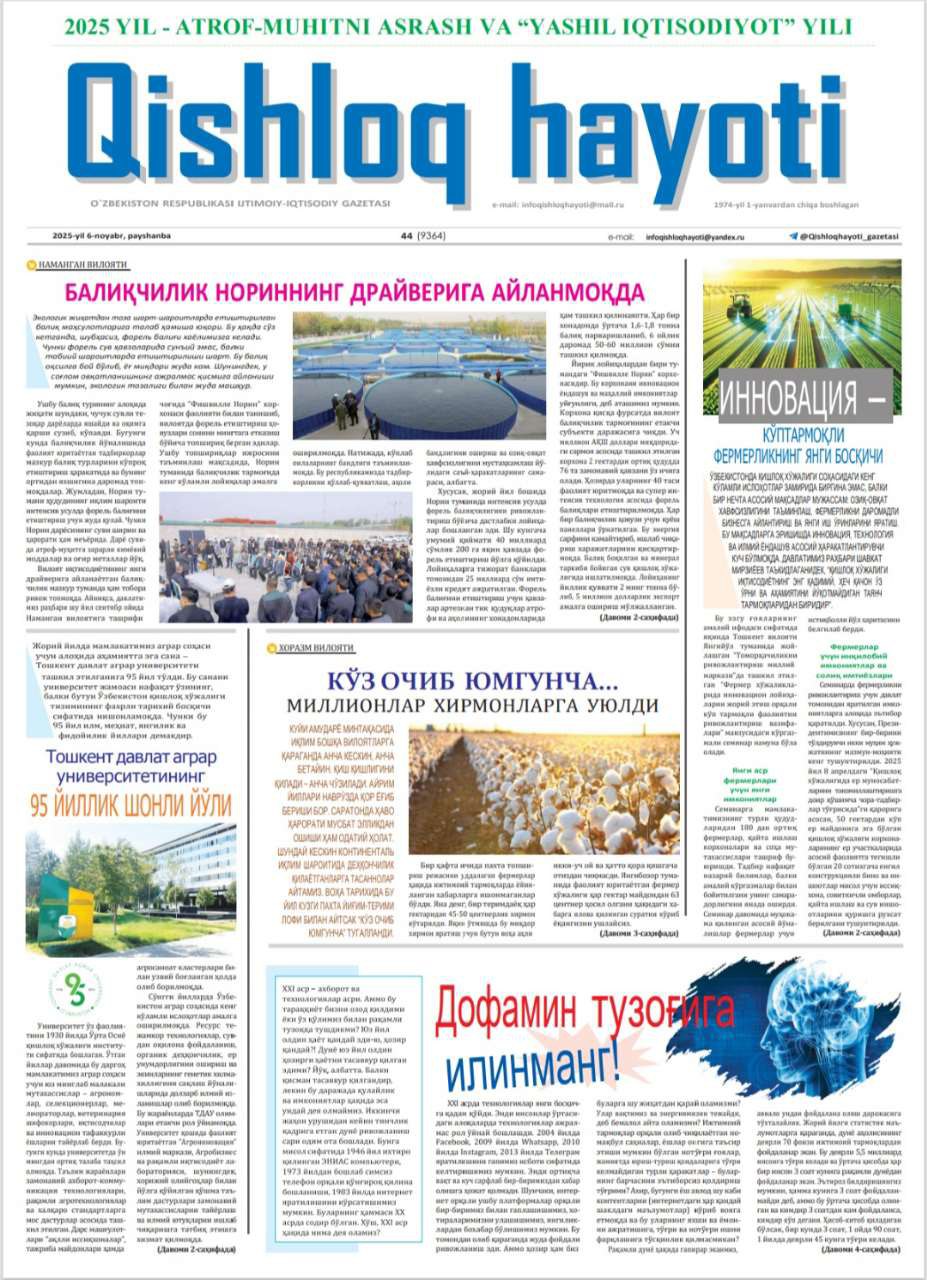 In the 44th issue of the newspaper “Qishloq hayoti” dated November 6, 2025, an article titled “The Glorious 95-Year Journey of Tashkent State Agrarian University” by J. Boboyev, Associate Professor of the Department of “Storage, Processing and Packaging of Agricultural Products” of Tashkent State Agrarian University, was published in honor of the university’s 95th anniversary.