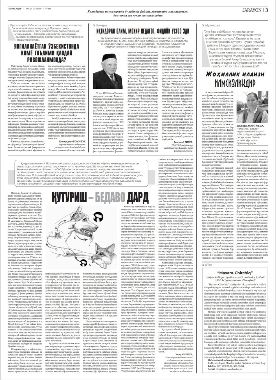 “In the November 20, 2025 issue (No. 46) of the Qishloq Hayoti newspaper, two articles were published: ‘He Was a Talented Scientist, a Skilled Teacher, and a Devoted Mentor’, dedicated to the memory of A. Abdusamatov and written by Professor of the Department of Natural Sciences at Tashkent State Agrarian University, Doctor of Chemical Sciences R. Ziyayev; and ‘Digital Technologies in Education: How Do Modern Tools Help Teachers?’ by Associate Professor of the Department of Higher Mathematics T. Turg‘unov.”