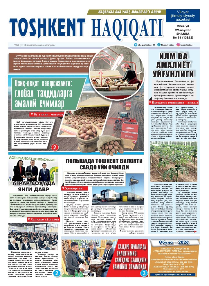 An article titled "A New Era in the Agricultural Sector", dedicated to the reforms and achievements of scientists of Tashkent State Agrarian University, has been published in the November 29, 2025, Issue No. 91 of the newspaper "Tashkent Haqiqati."