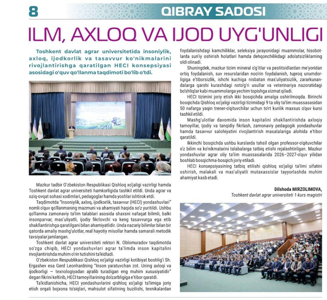 In issues No. 5–6 of the newspaper “Qibray sadosi” dated February 14, 2026, an article by D. Mirzolimova, a first-year master’s student of Tashkent State Agrarian University, titled “The Harmony of Science, Morality, and Creativity” was published.