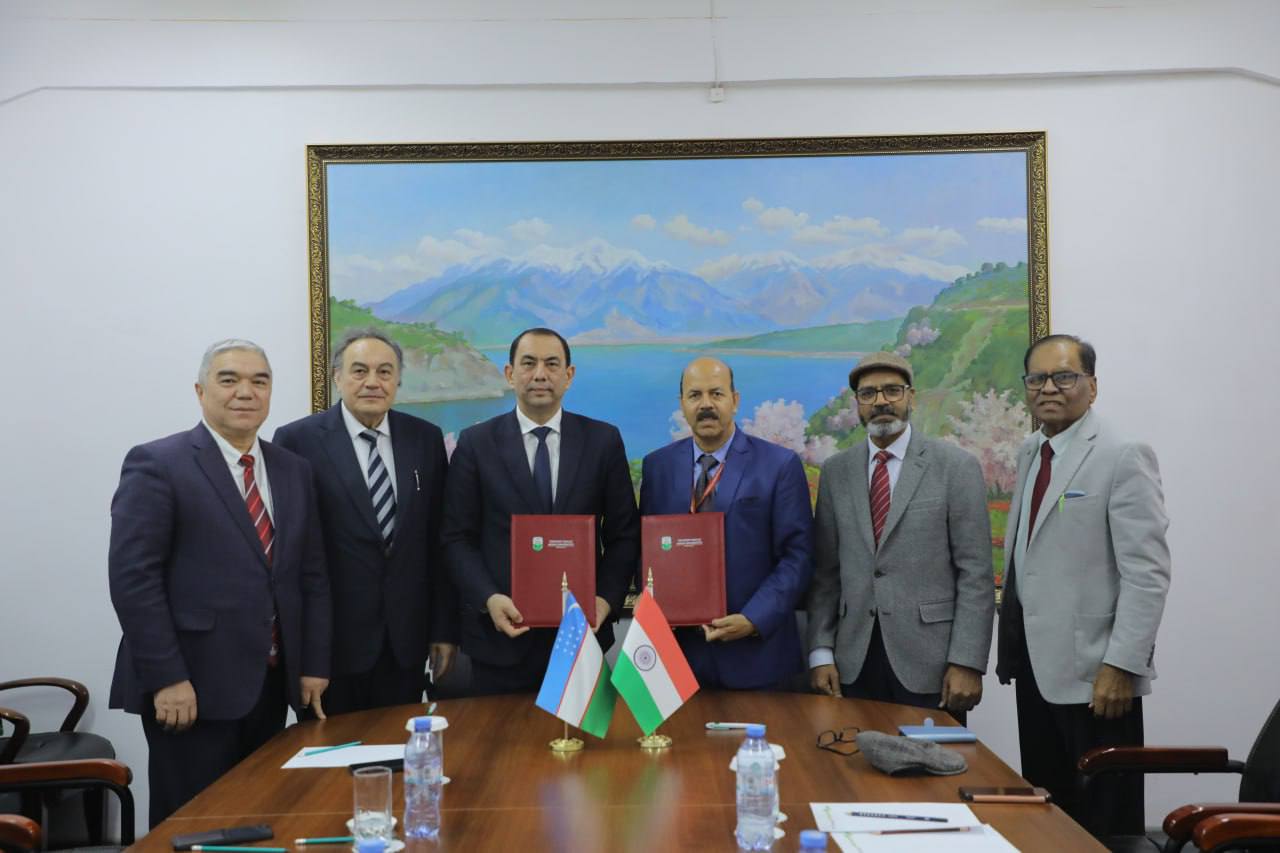 Today, Tashkent State Agrarian University hosted a meeting with a delegation from India's MERI University and Indira Gandhi Krishi Vishwavidyalaya. During the meeting, memoranda were signed to strengthen academic and scientific cooperation. Within the framework of the memorandum, the parties agreed on developing research activities, establishing academic exchange programs for faculty and students, expanding cooperation on scientific articles and publications, and conducting joint projects and research. The meeting was held in a friendly and cordial atmosphere. The parties exchanged views on future joint projects and strategic plans.