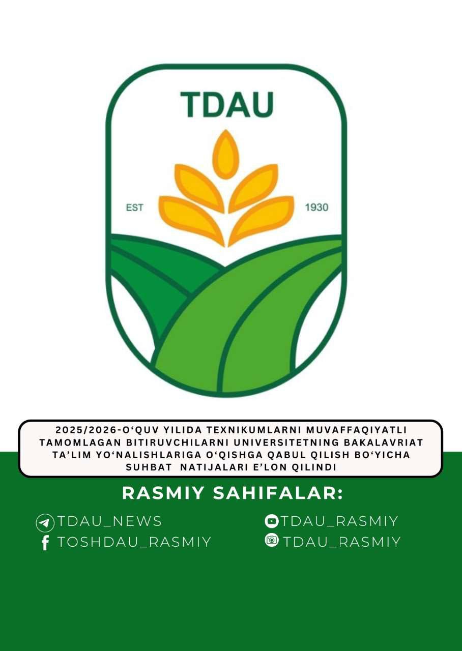 Tashkent State Agrarian University — with a 95-year history, advanced science, and innovations, further strengthens the agricultural potential of our country.
