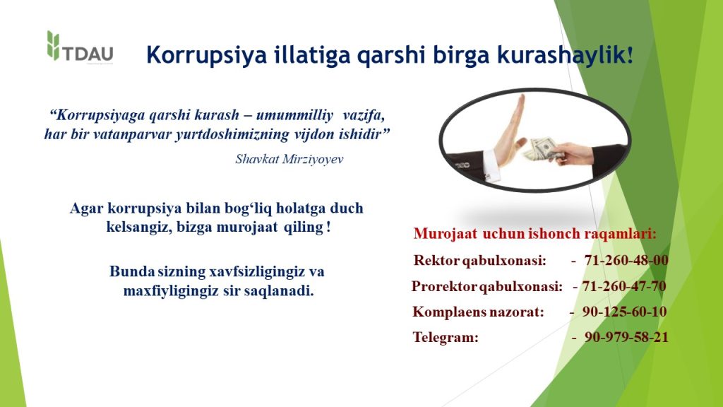Toshkent davlat agrar universitetida korrupsiyaga qarshi kurashish siyosati