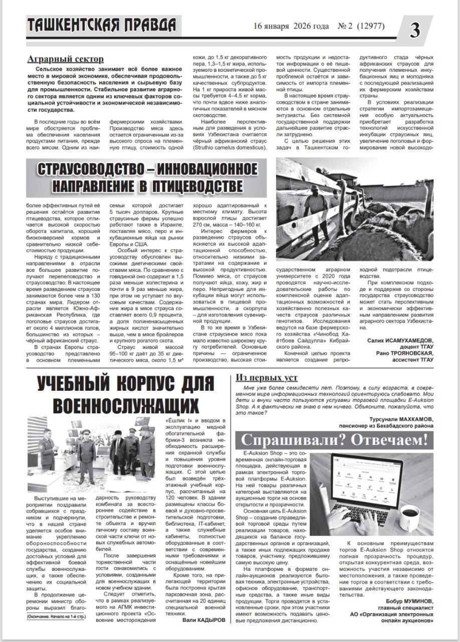 “Ташкентская правда” gazetasining 2026-yil 16-yanvardagi 2-sonida Toshkent davlat agrar universiteti dotsenti Salix Isamuhammedov va assistent Ra’no Troyanovskayalarning “СТРАУСОВОДСТВО – ИННОВАЦИОННОЕ НАПРАВЛЕНИЕ В ПТИЦЕВОДСТВЕ” nomli ilmiy-ommabop maqolasi chop etildi.