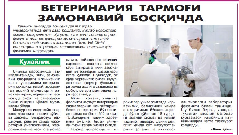 “Xalq so’zi” gazetasining 13-mart 49-sonida Toshkent davlat agrar universitetida “Inno Vet Clinic” innovatsion veterinariya klinikasining tantanali ochilish marosimiga bag’ishlangan “Veterinariya tarmog’i zamonaviy bosqichda” sarlavhasi ostida maqola chop etildi.