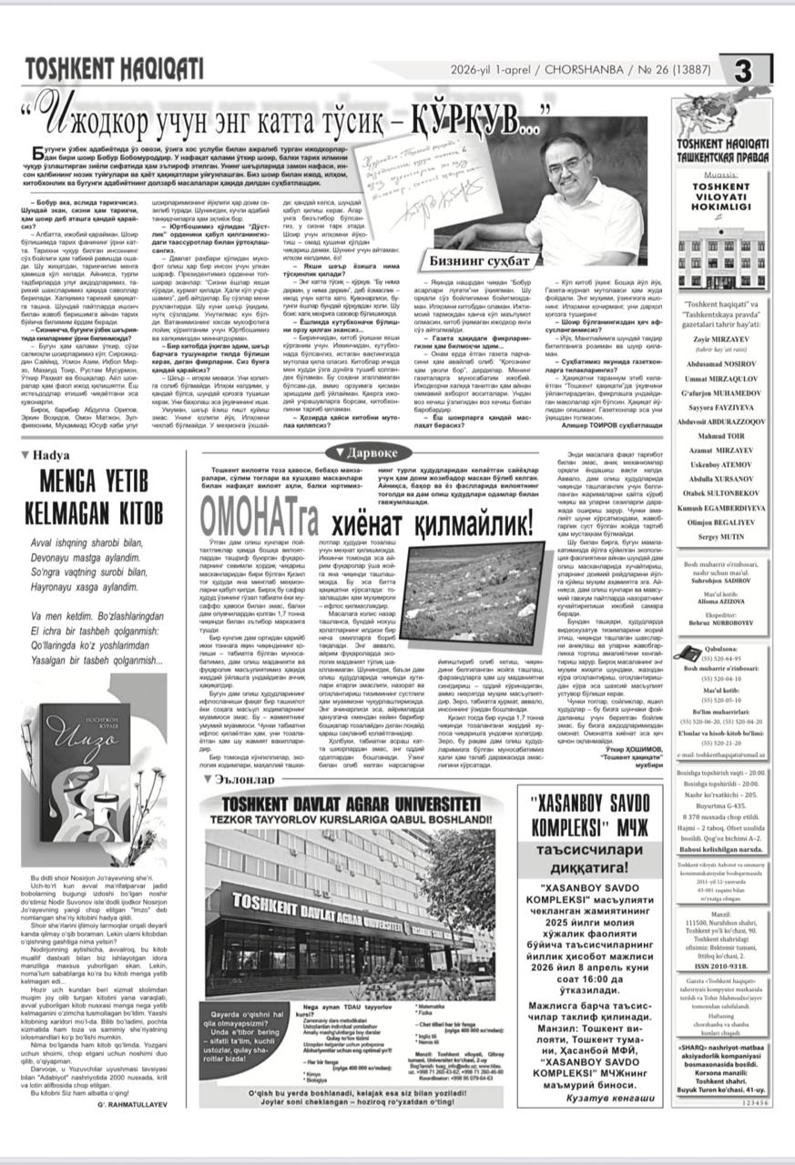 "Toshkent haqiqati" gazetasining 2026-yil 1-apreldagi 26-sonida