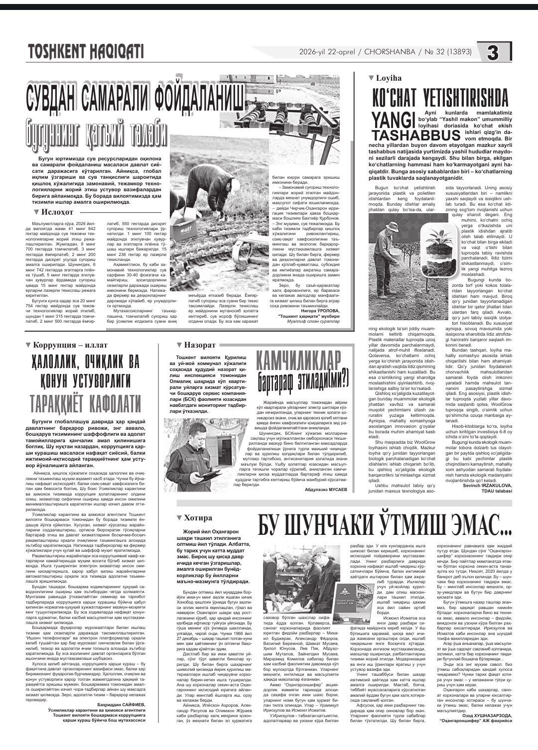 "Toshkent haqiqati" gazetasining 2026-yil 22-apreldagi 32-sonida Toshkent davlat agrar universiteti "Meva-sabzavotchilik va uzumchilik" fakulteti talabasi Irzaqulova Sevinchning "Ko'chat yetishtirishda yangi tashabbus" nomli maqolasi chop etildi