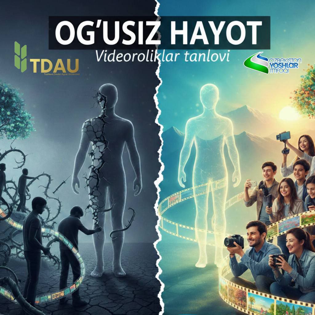Toshkent davlat agrar universiteti Yoshlar ittifoqi boshlang‘ich tashkiloti tashabbusi bilan “Giyohvandlikka qarshi kurash” oyligi doirasida universitet talabalari o‘rtasida “Og‘usiz hayot” mavzusida videoroliklar tanlovi e’lon qiladi. Tanlovning asosiy maqsadlari yoshlar o‘rtasida sog‘lom turmush tarzini targ‘ib, giyohvandlikning ayanchli oqibatlarini badiiy va kreativ usulda ko‘rsatib berish, talabalarning ijodiy salohiyatini qo‘llab-quvvatlash. Videoroliklarga qo‘yiladigan talablar: