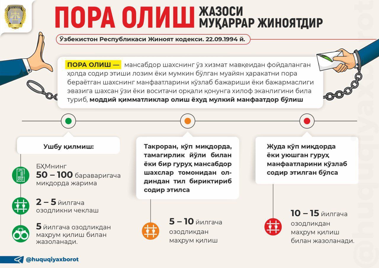 Pora olish va pora berish O‘zbekiston Respublikasi qonunlari bilan qat’iy taqiqlangan bo‘lib, baholashda adolatsizlik, tanish-bilishchilik yoki moddiy manfaat evaziga imtiyoz berish tenglik prinsipiga zid bo‘lib, bilimli va mehnatkash yoshlarning rag‘batini pasaytiradi. O‘qituvchi esa nafaqat bilim beruvchi, balki jamiyat uchun ma’naviy namuna bo‘lishi lozim. Yuqorida takidlangan harakatlar qòllanilgan holatlarda eng kam osh haqqining 50 - 100 baravarigacha jarima miqdori, 2-5 yilgacha ozodlikni cheklash, 5-yilgacha ozodlikdan mahrum qilish bilan jazolanadi.