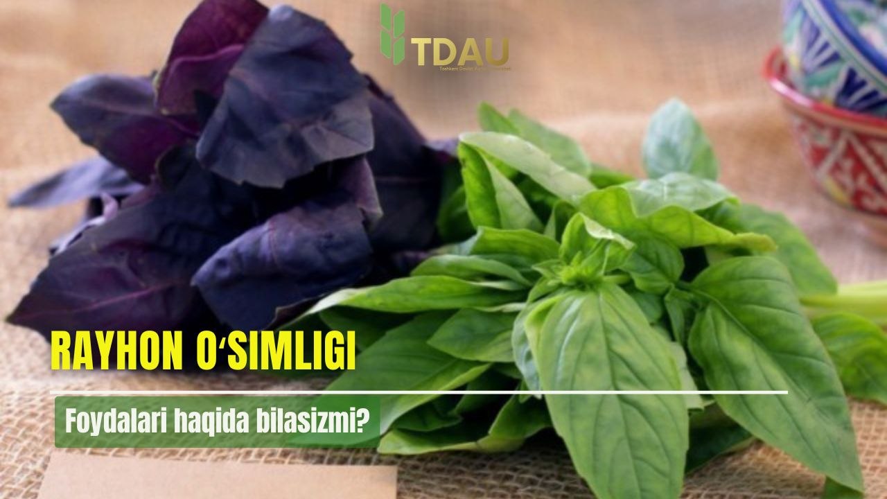 Rayhon (Ocimum basilicum) — xushbo‘y hidi va shifobaxsh xususiyatlari bilan mashhur bo‘lgan o‘simliklardan biridir. U bahor va yoz mavsumida keng tarqalib, ko‘plab taomlarga o‘zgacha ta’m va hid bag‘ishlaydi. Rayhon tarkibida C vitamini, efir moylari, antioksidantlar va foydali mikroelementlar mavjud bo‘lib, organizmni mustahkamlashga yordam beradi. Uni iste’mol qilish hazm jarayonini yaxshilaydi, ishtahani ochadi va ichki organlar faoliyatini qo‘llab-quvvatlaydi. Shuningdek, rayhon asab tizimini tinchlantiradi, stress va charchoqni kamaytirishga yordam beradi. U shamollashga qarshi foydali bo‘lib, immunitetni oshirishda ham muhim o‘rin tutadi. Rayhonni yangi holatda salatlarga qo‘shish, choy sifatida damlab ichish yoki turli taomlarda ishlatish mumkin. Uni me’yorida iste’mol qilish tavsiya etiladi.