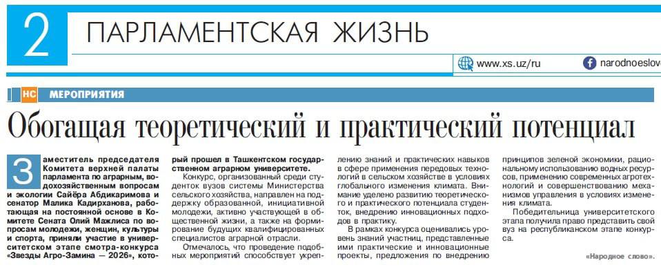 Статья об университетском этапе смотра-конкурса «Звезды Агро-Замина – 2026», прошедшем в Ташкентском государственном аграрном университете, опубликована в 37-м номере газеты «Народное слово» от 24 февраля 2026 года.