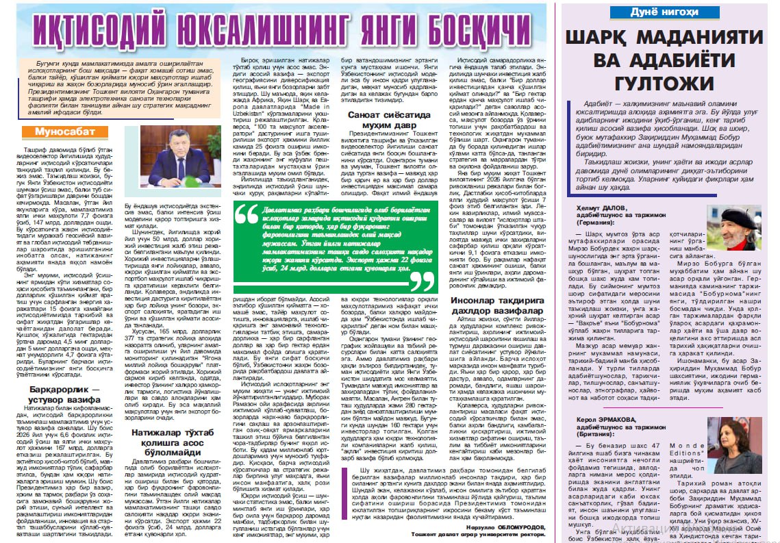 В 33-м номере газеты «Халк сузи» от 18 февраля 2026 года была опубликована статья ректора Ташкентского государственного аграрного университета Н. Обломурадова под названием «Новый этап экономического роста», посвящённая визиту Президента Республики Узбекистан в Ахангаранский район Ташкентской области.