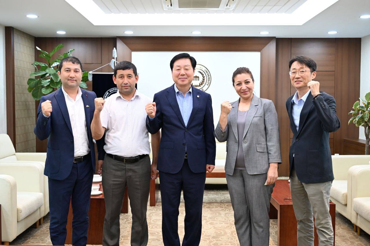 Tashrif doirasida universitetimizning “Mevachilik va uzumchilik” kafedrasi mudiri I. Namozov hamda katta o‘qituvchisi Sh. Valiyeva Janubiy Koreyaning Chungnam Milliy universiteti rektori, professor Kim Jeong Kyoum boshchiligidagi mas’ullar tomonidan samimiy kutib olindi. Uchrashuv davomida delegatsiya a’zolari universitetning o‘quv binolari, zamonaviy jihozlangan laboratoriyalari, ta’lim muhitiga innovatsion yondashuv hamda talabalar uchun yaratilgan sharoitlar bilan yaqindan tanishdilar. Suhbat yakunida Toshkent davlat agrar universiteti rektori nomidan Chungnam Milliy universitetiga esdalik sovg‘asi topshirildi. O‘z navbatida, professor Kim Jeong Kyoum ham TDAU rahbariyatiga universiteti nomidan ramziy sovg‘a taqdim etdi.