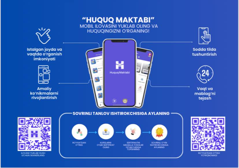 Mazkur bot orqali foydalanuvchilar huquqiy mavzulardagi o‘quv materiallari bilan tanishish, normativ-huquqiy hujjatlar bazasidan foydalanish, qiziqarli viktorinalar orqali bilimlarini sinab ko‘rish hamda zarur holatlarda huquqiy maslahat olish imkoniyatiga ega bo‘ladilar.