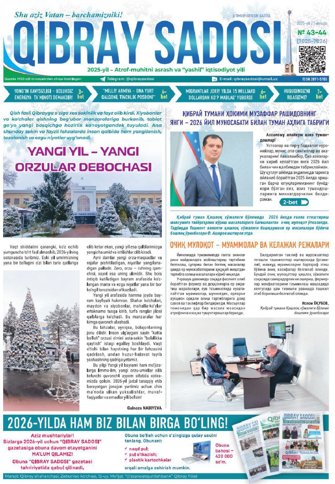 Toshkent davlat agrar universiteti talabasi F.Iksanovaning «Ekologik va sanitariya muammolariga amaliy yechim» va D.Abduvoxidovaning «Talabalik ģoyasidan startapgacha: Tabiy tola asosida toza suv» mavzusidagi maqolalari «Qibray sadosi» gazetasining 2025-yil 27-dekabrdagi 43-44-sonida chop etildi