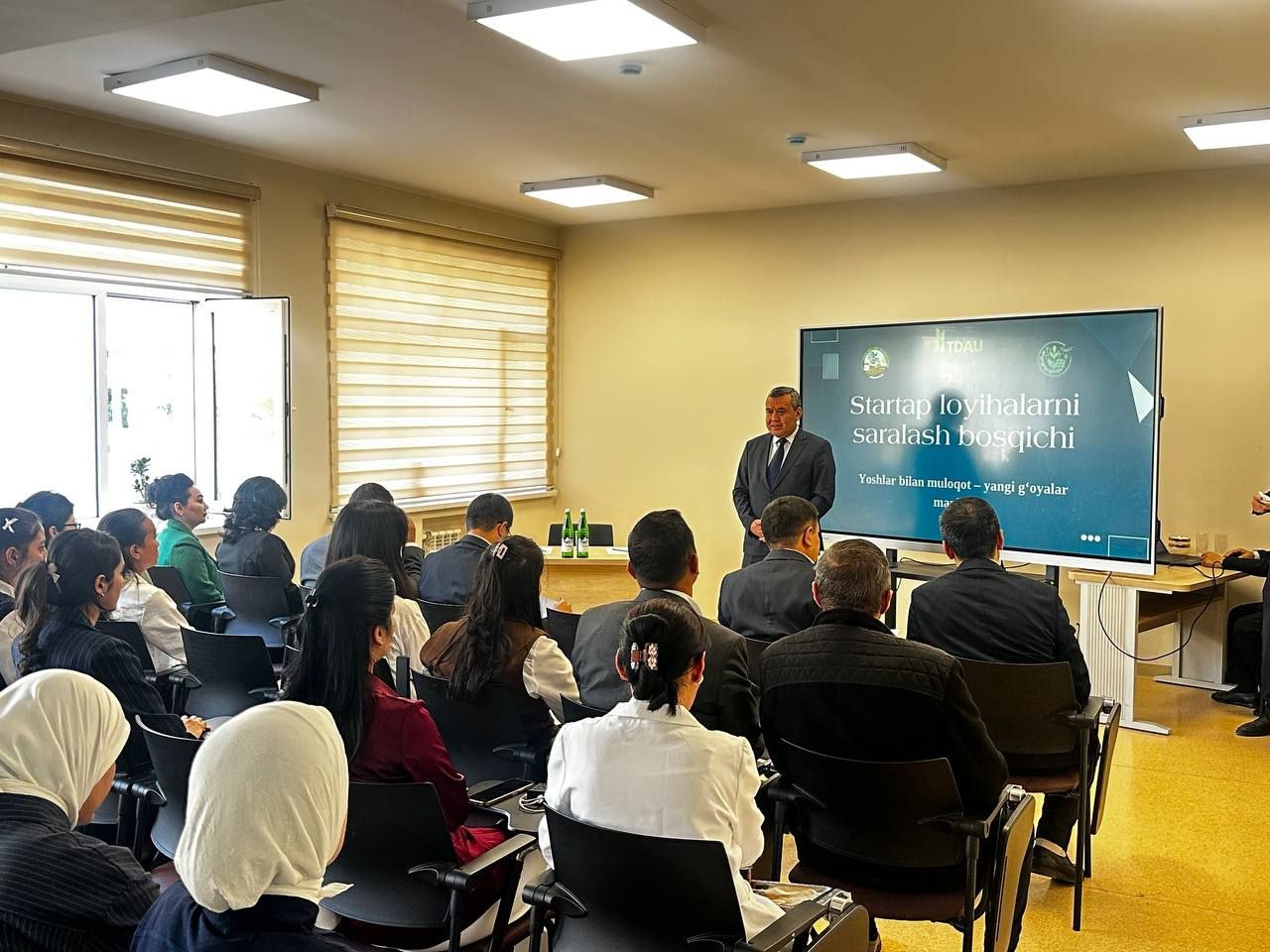 Toshkent davlat agrar universitetida talabalar tomonidan ishlab chiqilgan startap va biznes loyihalarini qo‘llab-quvvatlash hamda ularning amaliyotga joriy etilishini ta’minlash maqsadida uchrashuv tashkil etildi. Unda universitetning O‘rmon xo‘jaligi va landshaft dizayn fakulteti hamda Qishloq xo‘jaligi mahsulotlarini saqlash va qayta ishlash fakulteti talabalari tomonidan tayyorlangan startap loyihalar universitet Ilmiy ishlar va innovatsiyalar bo‘yicha prorektori Kamoliddin Sultonov boshchiligida o‘rganib chiqildi. Jarayon davomida talabalar o‘z biznes g‘oyalari, innovatsion ishlanmalari hamda kelajakdagi rejalari haqida batafsil taqdimotlar o‘tkazdilar. Har bir loyiha yuzasidan mutaxassislar tomonidan amaliy tavsiyalar berildi, loyihalarni takomillashtirish va investitsiya jalb etish masalalari muhokama qilindi.
